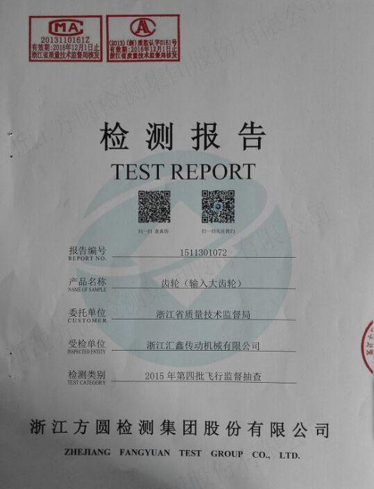 發(fā)布日期:[2016-01-04] 點擊率:浙江匯鑫傳動機械有限公司擁有著完善的檢測設(shè)備、先進的生產(chǎn)工藝、專業(yè)的制造技術(shù)、完善的質(zhì)量管理體系、具有雄厚的研發(fā)技術(shù)實力。優(yōu)良的減速機等傳動產(chǎn)品一直享有廣大用戶的認可和好評。產(chǎn)品質(zhì)量不但通過IS09002質(zhì)量體系標(biāo)準(zhǔn)認證,且在2015年12月通過了浙江省技術(shù)監(jiān)督局的突擊抽查,雖然是突如其來的隨機抽查,但結(jié)論證明匯鑫產(chǎn)品的品質(zhì)始終經(jīng)得起考驗,所謂“內(nèi)行看門道”,業(yè)界的有識之士更明白這一張張用數(shù)據(jù)說明的《檢測報告》其含金量,比華麗的品牌包裝更具有說服力,這代表著浙江匯鑫傳動機械有限公司的硬實力,更標(biāo)志著匯鑫產(chǎn)品打造國內(nèi)一流品牌的里程碑!
